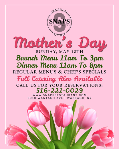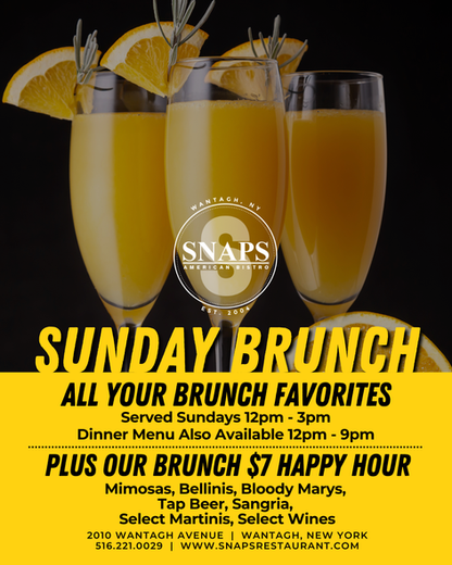 Owned and operated by Scott and Patty Bradley, Snaps American Bistro is a casual neighborhood restaurant located in Wantagh, New York. Snaps strives to deliver great service and high quality food at moderate prices. After working in some of Long Island and Manhattan’s top kitchens, Scott decided to branch out and open his own restaurant. Snaps American Bistro offers a creative American menu, as well as a thought-out beer, wine, and cocktail list. The menu includes appetizers, such as the short rib quesadilla, lobster knuckle sandwich, and chicken wings. The honey lavender roasted duck, beef wellington, and foie gras are a few of the notable high-end entrée options. Snaps also has a large selection of salads, sandwiches, 17 unique burgers, and an eight-course chef’s tasting menu. With the addition of an expanded dining room, a lager copper-topped bar and high-top tables, and flat screen TVs, Snaps offers something for everyone.